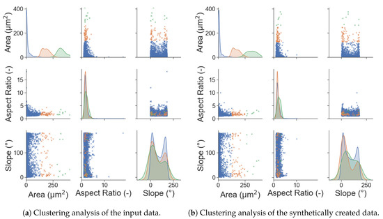 To further investigate whether the dependencies between the microstructural parameters were accurately reproduced, a clustering analysis was performed on the microstructure data. For this analysis, the area data were divided in three evenly sized batches that were subsequently plotted like the results were before. To see if the dependencies were correctly reproduced, each of the batches was given a different colour, allowing individual batches to be tracked. This clustering analysis is pictured in Figure 10. In this figure, the orange and green points are of special interest. The KDE distributions fit very accurately, which was to be expected after the very good fit of the complete KDE functions before. A comparison of the AR—Slope chart shows that each of the orange and green points (which stand for grains with larger areas) is in a very similar position, but not the same. Most of the relevant points are at smaller aspect ratios and positioned near the 0 or 180. No outliers are found in this analysis, which leads to the conclusion that the interdependencies of the input data can be accurately portrayed.