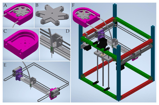 3D printed pump components and the X-axis, where the nozzle is fixed, modeled in CAD (Computer-Aided Design) software. (A) assembled peristaltic pump used in the system to extrude hydrogel, (B) rotor equipped with rollers, (C) core of the pump, (D) nozzle holder with heated nozzle and timing belts attachment, (E) assembled the X-axis of the printer, (F) general view of the 3D printer design.