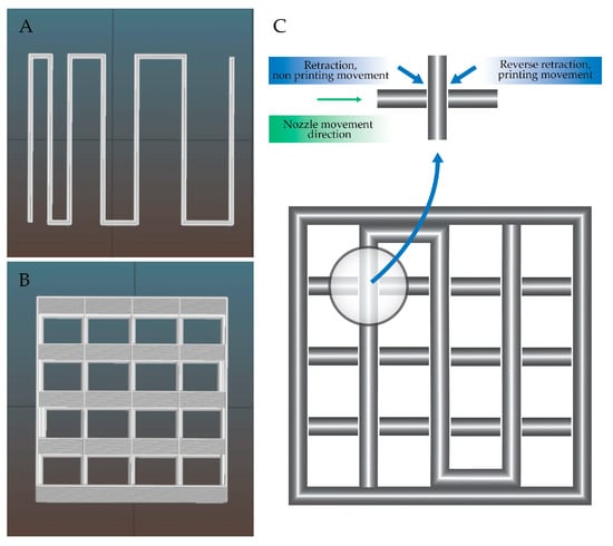 The retraction function was used per each layer. It was computed automatically in the places of crossing of the lines (Figure 3C) and was performed as follows: when the nozzle makes a printing motion and reaches a perpendicular line, the material is retracted. The nozzle makes a non-printing movement, i.e., it moves up towards the Z axis (it moves above the already printed line). Then it slides down the Z axis and performs reverse retraction and starts a printing movement.