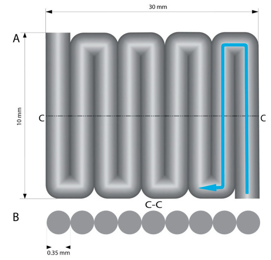 (A) Model for layer adhesion testing. Original dimensions: 30 mm long, 10 mm wide, 0.35 mm high. Arrow shows schematic trace of nozzle movement during printing. (B) Model cross section view (C-C). The diameter of the printed path equals 0.35 mm.
