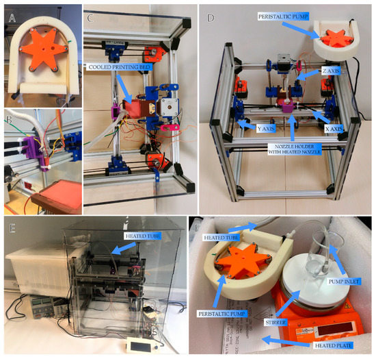 Pictures of the constructed 3D bioprinter with all integrated and tested elements. (A) peristaltic pump, (B) nozzle holder with heated nozzle and timing belts attachment, (C) assembled the X-axis of the printer and cooled printing bed, (D) a general view of the 3D bioprinter construction, (E) printing system view: pump isolated container and printer “cage”, (F) pump isolated container with stirred reservoir and heating system.