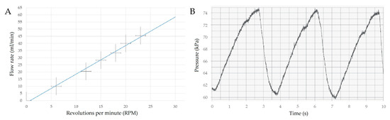 The results of the investigation of the constructed peristaltic pump (Figure 6A) confirmed the proper device operation. Additionally, the measurement of pressure fluctuations showed that these are repeatable (Figure 6B). The tests proved that this device has been designed and manufactured in an appropriate way and meets the requirements for micro-extrusion of high-viscosity materials used as ink in the bioprinting process.