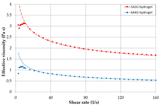 The flow curves for two investigated hydrogels: 5A3G and 6A4G, are presented in Figure 7. Changes of viscosity clearly indicate non-Newtonian fluids. Beside the range of the shear rate lower than 10 s−1, the fluids show continuous viscosity drop and can be classified as pseudoplastic (shear-thinning) fluids. Ostwald de Waele model can be used to approximate the relationship between the effective viscosity and the shear rate , where k is the viscosity consistency parameter and n is the power law index. The coefficient values k = 5.6 Pa·s, n = 0.76 and k = 2.5 Pa·s, n = 0.70 for 5A3G and 6A4G were used, respectively to approximate data as shown in Figure 7.