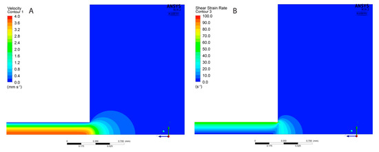 Velocity (A) and shear strain rate (B) contours at the inlet of the nozzle for 5A3G hydrogel.