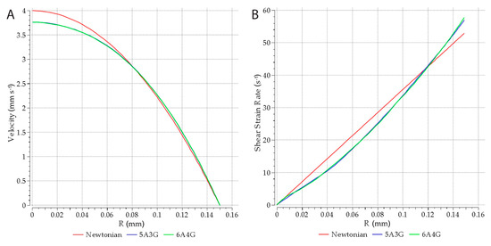The velocity and shear strain rate distributions obtained from the simulations are presented at the nozzle inlet in Figure 8A,B for 5A3G hydrogel. Results for 6A4G hydrogel differed only slightly. They clearly showed that the entrance length in the nozzle was very short. The flow was fully developed (velocity profile shape became constant) at the distance of a half of the nozzle diameter from its inlet. This was in agreement with the entrance length according to relation (Le = 0.05 · D · Re) [37] which, for such low Reynolds numbers as in the cases under analysis, are negligibly short. The fully developed velocity and shear strain rate distributions along the nozzle radius are shown in Figure 9A,B for 5A3G and 6A4G hydrogels as well as for a Newtonian fluid (with the same density, but constant viscosity equal to 0.8 Pa·s). In general, no differences in the distributions for both hydrogels were observed. Additionally, the distributions of velocity for hydrogels did not differ significantly from the parabolic function for Newtonian fluids. However, it was clear that the higher effective viscosity for low shear rates caused a decrease of the maximal velocity of hydrogels at the pipe axis. Similarly, the shear strain rate distribution along the radius differed from the linear function for the Newtonian fluid.