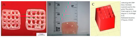Fabricated objects were measured using calliper with resolution of 0.02 mm. Measurements were conducted in X, Y and Z direction of the sample. A total of five samples were measured three times in each direction. Tests were carried out on a single line print and multilayer grid. Tested model dimensions were: 12.5 × 12.5 × 0.35 mm (XYZ) (Figure 3A) and 13.6 × 13.6 × 11 mm (XYZ) (Figure 3B).