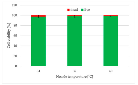 The biological study assessed the influence of 3D printer construction (peristaltic pump, temperature stabilized bioink reservoir and tubes, a heated nozzle) on cell viability. The results showed that heating the nozzle above the 37 °C (which is considered the optimal for eukaryotic cells) did not affect cell viability, but could even increase their survival if they were immersed in the bioink. Figure 13 shows the result of cell viability evaluation for printouts produced with nozzle heated to 34, 37 and 40 °C. Although these were not significant differences, one can notice that cell survival was the highest for the nozzle with temperature equal to 40 °C (Figure 13). This was due to the low viscosity of the hydrogels at the temperature of 40 °C, which generated the lowest shear stress as was shown before [33].