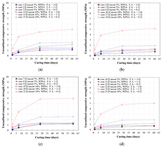 3.1. Unconfined Compressive Strength Versus Mixing Ratio between WPSA and Fly Ash