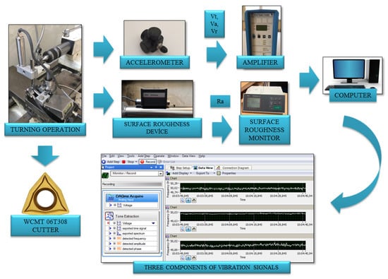 The experimental setup includes the machine tool, measuring devices, sensors, data acquisition units and a computer. The experimental setup is shown in Figure 1. For measuring the vibration, an accelerometer which can sense the three components of acceleration was utilized. The accelerometer (Kistler 8692C50, Winterthur, Switzerland) can be mounted on the machine parts using the magnetic part at its base. In addition, it can be permanently fixed on the free surfaces with its special adhesive. The accelerometer is attached to an amplifier (Kistler 5134B) for accommodation and compensation of data before data transmitting. Vibration data were transmitted to the computer via the data acquisition card (National Instruments USB-6003, Austin, TX, USA), the processing and recording of the signals were performed via Signal Express software.