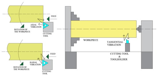 In machining, vibration occurs due to a lack of rigidity in the machine tools and cutting tool clamping or due to changing cutting conditions during the cutting process [28]. Vibration is an undesirable phenomenon that negatively affects the cutting process [29]. In general terms, vibration can be described as an oscillation around an equilibrium point which occurs in the form of disruption of the contact area between the tool geometry originally determined for cutting and the workpiece [30]. During the relative movement of the cutting tool and the workpiece, undesirable results such as the loss of the theoretically determined tool geometry occur and thus the surface form of the workpiece is deformed [31].