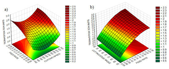 Figure 3a,b shows the impact of cutting speed, feed and cutting edge angle on surface roughness. Considering the feed rate as the most influential factor, the change with two other parameters on surface roughness was investigated. It is observed that the increase in feed rate reduces the surface roughness. It is expected that the broader helicoidal groove which arises from a higher feed rate will eventually raise the surface roughness [15]. On the other hand, increasing the cutting edge angle slightly increases the surface roughness, which can be ignored. A higher cutting edge angle leads to the sudden entrance of cutting tool into the workpiece which causes elevated cutting forces; the material becomes hard to cut and eventually increases in surface roughness [33]. However, the surface roughness curve shows a decreasing trend first and increases after that with enhancing cutting speed. Because the hardness of the workpiece reduces with high cutting speed then surface roughness decreases, generating the desired shaped chips [58] until a determined cutting speed value. After that point, accelerating tool wear arising from high cutting speed escalates surface roughness again [15]. The highest value of surface roughness is observed at the highest values of feed rate, cutting speed and cutting edge angle used in the study.