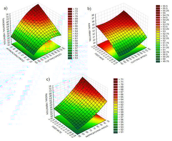 Based on ANOVA, the parameters effective on vibration components are presented in Figure 4. It can be seen in Figure 4a that tangential vibration shows a rising trend with enhancing cutting speed and the rate of increase strengthens with increasing cutting edge angle. Since the cutting speed and tangential vibration occur in the same direction, increase in cutting speed improves acceleration due to the accumulation of chrome and related hard carbides. Additionally, chrome ingredients cause adhesive wear on the rake face of the cutting tool [5], which eventuates the rise of tangential vibration. It can be also that higher feed rate values accelerate axial vibration for all cutting speeds, which is demonstrated in Figure 4b. Similarly to the effect of cutting speed on tangential vibration, a high content of chrome disorders the stability of the cutting tool and tends towards oscillation. On the graph of radial vibration, it can be seen in Figure 4c that advancing cutting edge angle significantly improves radial vibration and this impact increases with higher feed rate values. Cutting edge angle settles the separation of cutting forces additional to feed rate, depth of cut and specific cutting force. In this context, an increase in cutting edge angle enhances the axial cutting force. However, variation in the feed rate dominates this direction and can alter the effect of cutting edge angle on studied outputs. As a result, increasing the cutting edge angle demonstrates its effect on the radial direction and triggers the vibration.