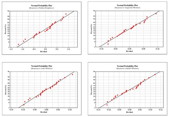 Normal probability plots of residual values and prediction success for surface roughness and vibration components are presented in Figure 5. The adequacy of the model was verified when plotting the normal probability plots [41]. The deflection from a straight line refers to separation from normality. Half of the data points occur on the left and the other half on the right side of the straight line. The general view of the graph is specified with a line accepted to be approximately straight and separating the screen into two parts based on the data points located on it. It is shown by the graph that the data points pursue the straight line which demonstrates the proposed model is sufficient to show the suitability. All of the four graphs referring to surface roughness and three-dimensional vibrations demonstrate a similar structure. According to the graphs, the normal probability plot shows a reasonably linear pattern.
