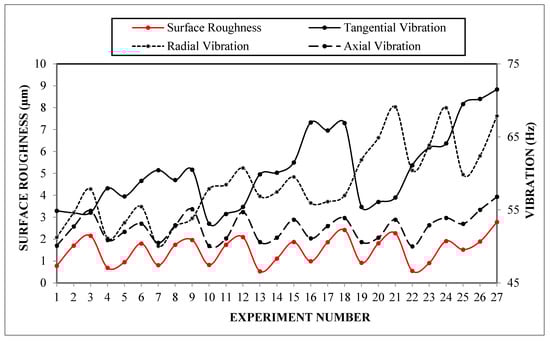 Considering the developed regression models and their adequacy, the experimentally obtained data such as cutting forces, vibration or acoustic emission in machining operations can be useful for observing the condition of the cutting tool and cutting process. Figure 6 contains the data of surface roughness and vibration components for each experiment. By taking into consideration the sensor signals of acceleration and surface roughness measurement, data points were marked in order to observe the similarity. There have been several attempts to predict surface roughness via vibration signatures. Axial and radial vibration was used [47] and radial vibration was also utilized to estimate the surface roughness [48]. In another work [46], axial vibration provided the best information for estimating the surface roughness. It was difficult in this study to compare the vibration components by reflecting upon the capability of surface roughness. According to the curves in Figure 6, axial vibration demonstrates close behavior to surface roughness variation which can be attributed to the effect of feed rate. The dominant effect of feed rate on both axial vibration and surface roughness provided the information to find the similarity. For a whole experimental plan, surface roughness and axial vibration curves pursue a similar decreasing or increasing path. It is also remarkable that the minimum frequency ranged vibration component—the axial—indicates a proximate characteristic to surface roughness. The radial vibration component on the other hand, has promising behavior for successfully monitoring the surface roughness during the first nine experiments, namely turning at low cutting edge angle values. However, tangential vibration has no beneficial notion regarding the surface roughness during turning of AISI 5140 steel.