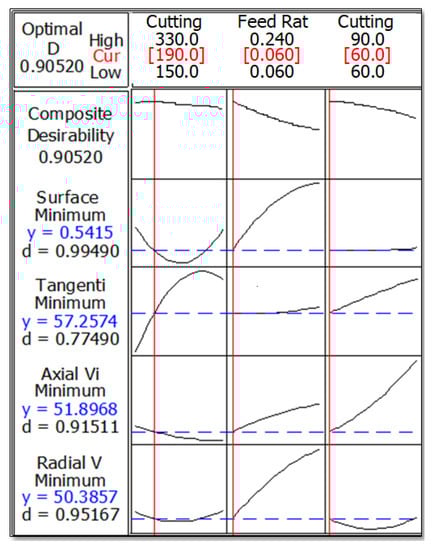 Figure 7 indicates the optimum cutting conditions and related optimized response parameters. High and low show the boundary conditions for cutting conditions and the optimum values are marked in red. y indicates achieved optimum value while d implies the desirability for each parameter. According to results, V = 190 m/min, f = 0.06 mm/rev and κ = 60° should be selected for optimization. As it was stated before, a multi-criteria optimization approach was chosen to obtain minimum surface roughness and vibration components. It was reported that low feed rate and high cutting speed should be selected for minimum surface roughness [35]. Despite there being various studies regarding finding desirable surface roughness based on optimum cutting parameters, it should be investigated further by introducing additional input parameters into the model. For example, cutting edge angle has been researched by very few studies in the past. Moreover, three components of vibration have not been simultaneously optimized before. In this study, RSM based optimization was implemented for multi-criteria optimization of surface roughness and vibration based on three input parameters (cutting speed, feed and cutting edge angle).
