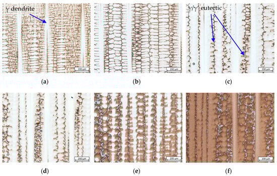 - Crystallization of γ matrix: at 1476.88–1521.15 K characterized by dendrite tips as seen in Figure 2a. According to the liquidus temperatures of 1610 K (CMSX-6 and CMSX-6+0.03C) and 1652 K (MAR-M247), the existence of undercooling by 103.27–134.26 K is evident since crystallization was initiated bellow the supposed temperatures.
