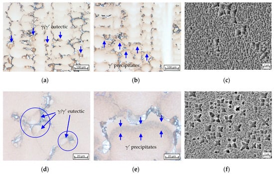 Figure 3. Microstructure images indicating: (a,d) γ/γ’ eutectic formation point; (b,c,e,f) the earliest precipitation of γ’ phase. Images (a,b,d,e) represent the LC-MZ sample of CMSX-6+0.03C (W4), (c) the CMSX-6+0,03C (W1) and (f) MAR-M247 (W1), respectively.