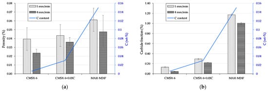 Since voids contained within the samples were irregular in both shape and size, their formation was obviously a consequence of solidification shrinkage. In Figure 4a, porosity results for single crystal parts directionally solidified at both rates are presented. It indicates that porosity is strongly influenced by carbon content in the alloy and therefore the amount of carbide formed throughout the structure. Increasing carbon content leads to an increase in porosity, with an average value of 0.061% and 0.024% being the highest and lowest found in MAR-M247 (W1) and CMSX-6 (W4), respectively. However, the existence of porosity in samples with higher cooling rate was slightly dampened by roughly 0.008–0.016%. This reduction in porosity is associated with a decrease in carbide fraction at higher cooling rate. During DS, shrinkage occurs around the solidifying crystal while the remaining liquid above gravitationally flows to compensate the shrinkage. The presence of carbides in the interdendritic region significantly reduces its permeability, which leads to an elevated amount of porosity with increasing carbon content and thus carbide fraction [27,29].