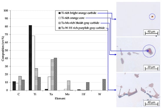 Another portion of carbides without inclusion of alumina particles is also built up by two distinct colors having two different chemical compositions, i.e., an orangish core and a bluish gray overlay, while the rest of the carbides are completely bluish gray in color. On the other hand, the alloy with extremely low amount of carbon contains carbides in bright orange, which indicates that the carbides are rich in Ti whose content may reach approximately 81 wt.%. The bluish gray color represents carbides with high amount of Ta (~39 wt.%) and Mo (~12 wt.%) but not as much Ti (~27 wt.%). In MAR-M247 samples, carbides with another distinct composition, i.e., rich in Ta (~40 wt.%), W (~14 wt.%) and Hf (~10 wt.%) but less in Ti (~16 wt.%) and Mo (nearly zero), were found. The content of carbon in each carbide varies as well, from ~9–11 wt.% in bright orange and orangish carbides to ~18 wt.% in bluish gray carbides. Since carbide nucleation and growth are controlled by the cooling rate and carbide FEs enrichment during γ dendrite growth, this variation in chemical composition implicates that carbides are formed through several stages [20,34].