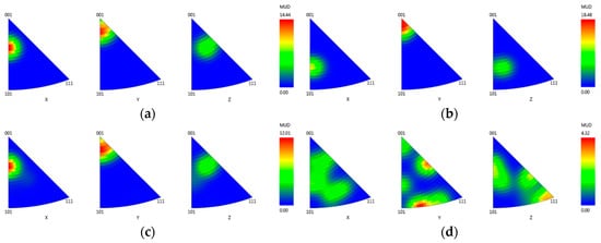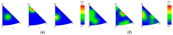 Since carbides are repeatedly reported to grow directly from the melt, they become one of the structure-building phases emphasized in the crystallographic analysis. Accordingly, inverse pole figures (IPFs) of TaC and TiC as the dominant carbide constituent are constructed along with that of Ni as the matrix as depicted in Figure 8. A greater tendency for misorientation can be clearly observed at higher cooling rate. The strength of clustering of poles in Ni IPF of CMSX-6+0.03C (W4) shifts further from and closer to , while the pole clustering strength in IPF of both carbides are unevenly scattered. At lower cooling rate, the pole clustering strength in all IPFs generally congregates at . This might be caused by the narrow and deficient time provided for atoms in the carbides to collocate at high cooling rates.