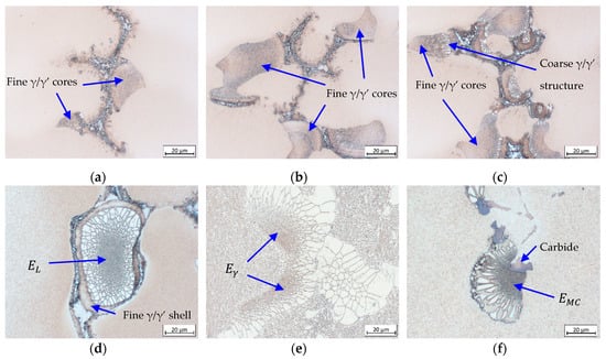 γ/γ’ eutectic formation: (a–c) formation sequence observed in LC-MZ sample of CMSX-6 (W4) and (d–f) the three distinct types of γ/γ’ eutectic islands found in all samples ((d) EL; (e) Eγ; (f) EMC).
