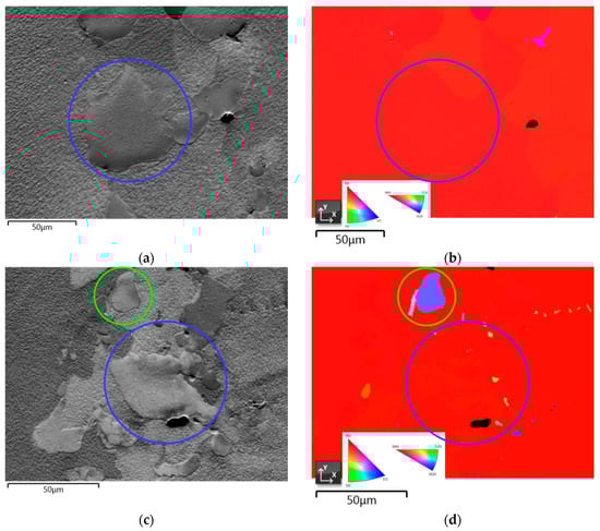 EBSD analysis results of LC-SC samples of CMSX-6+0.03C showing: (a,c) SEM images; (b,d) IPF mapping directionally solidified at 0.13 (a,b) and 0.4 (c,d). The blue circles represent the Eγ-type eutectic islands, while the green circle refers to the EMC type.