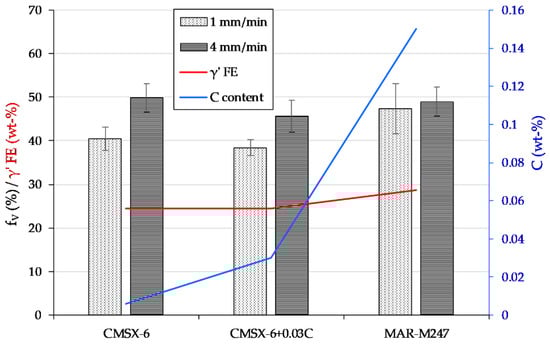 Assuming that the γ’ phase precipitated in ideal-cubic morphology with a completely identical size whose particle distribution was uniform such that the channel width was the same everywhere, γ’ volume fraction was calculated from the area fraction [43]. The γ’ area fraction was obtained with the assistance of ImageJ. The calculation results are plotted in Figure 11 in juxtaposition with the compositions of carbon and γ’ FEs. The latter includes Al, Ti and Ta, which are beneficial for inducing γ’ precipitation, as well as Cr, Mo and W, which are functional for enhancing the γ’ volume fraction [10]. A strong correlation of withdrawal and thus cooling rate on the of the γ’ precipitates could be observed. In that regard the γ’ particles at higher cooling rate are finer and denser, which is supported by calculation results signifying greater values of and a previous study [44]. The maximum and minimum values of of 49.8% and 38.39% are established in CMSX-6 and CMSX-6+0.03C solidified at 0.4 and 0.13 , respectively.