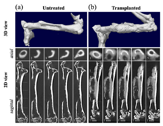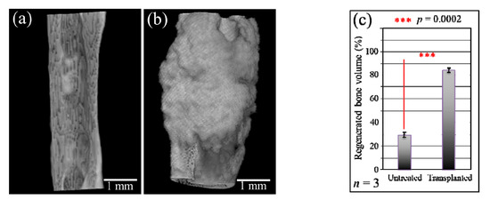 High-magnification μCT images of the bone defect before (a) and after (b) regeneration; (c) shows the quantitative assessment of the volume fraction of regenerated bone in the untreated and the transplanted bone.