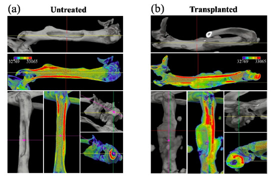 Color scale on μCT 3D views for untreated (a) and transplanted (b) femurs; red and blue colors represent the highest and lowest bone density, respectively.