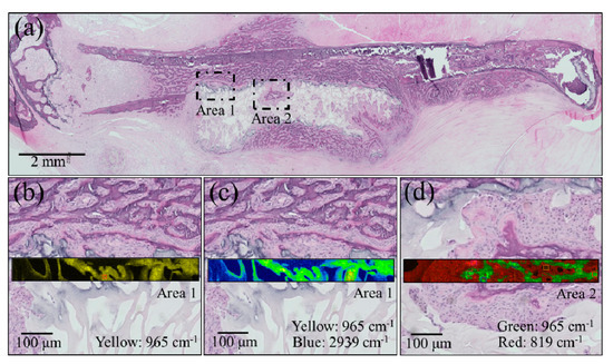 After euthanizing the mice, the dissected femurs were fixed with 10% neutral-buffered formalin. Undecalcified resin-embedded histological sections were stained with HE, and bone cross sections were then analyzed with a light microscope. These histological analyses, shown in Figure 4a, suggest that the NanoCliP-FD scaffold partly retained its structure due to calcification and continued to work as a scaffold for cells while acting as a spacer that prevented the regrowth of other tissues into the bone defect. Higher resolution images taken in two different areas (see square insets in (a)) are shown in sections (b) to (d) of the same figure. These enlarged locations were also imaged by Raman spectroscopy. Raman maps that correspond to the newly grown bone at the interface with the scaffold were collected. The Raman map in Figure 4b (Area 1) shows the intensity of the apatite mineral band (i.e., the PO43− stretching band) located at ~965 cm−1 in yellow tones. The images in Figure 4c show the same zone with respect to the overlapping intensities of the 965 cm−1 PO43− stretching band (yellow) and the CH2 region from either collagen or the scaffold (i.e., vibrations arising from cholesterol centered at ~2939 cm−1 (blue)). In the Area 2 region (enlarged view in Figure 4d), the Raman map depicts the 965 cm−1 PO43− stretching band of apatite in green and the CCH in-plane bending band at 819 cm−1 belonging to the collagen matrix in red. The Raman maps collected according to different frequencies and in different regions of the regenerated bone consistently indicated the formation of bone mineral corresponding with the NanoCliP-FD implant, and the inside of the porosities of the scaffold, in particular, show a perfect adherence with the internal surface.