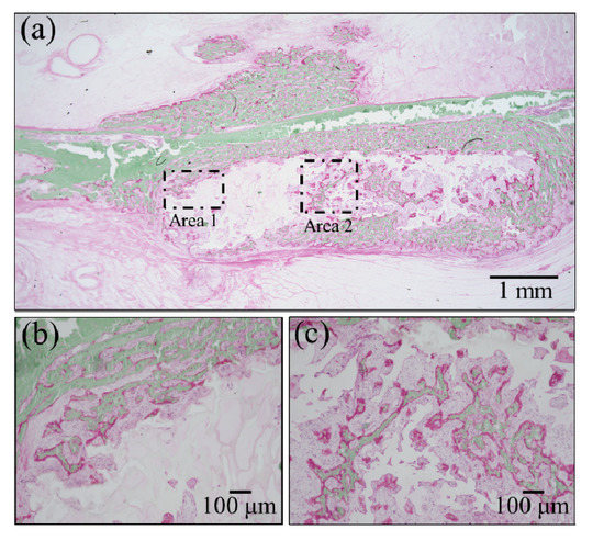 Results of Villanueva–Goldner staining: (a) low-resolution histological image of the regenerated bone treated with the NanoCliP-FD scaffold; enlargements of the square insets are shown in (b) and (c) for Area 1 and Area 2, respectively; mature and immature bone in green and violet, respectively.