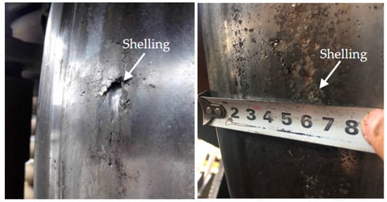- Cong, T.; Han, J.; Hong, Y.; Domblesky, J.P.; Liu, X. Shattered rim and shelling of high-speed railway wheels in the very-high-cycle fatigue regime under rolling contact loading. Eng. Fail. Anal. 2019, 97, 556–567. [Google Scholar] [CrossRef]