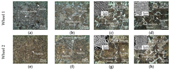 - With the increase in Mo content from 0.01 wt.% (wheel 1, i.e., standard wheel) to 0.04 wt.% (wheel 2, i.e., improved wheel), the proeutectoid ferrite content and the pearlite interlamellar spacing were reduced. With the increase in depth, the proeutectoid ferrite content and the pearlite interlamellar spacing increased.