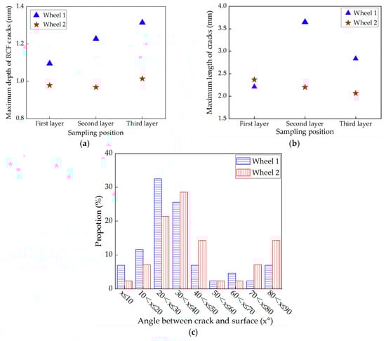 - Shelling and RCF cracks were generated on the wheel materials after the tests. The crack depth and length of wheel 2 (improved wheel) were smaller than those of wheel 1 (standard wheel). With the increase in the depth of the sampling position, the crack depth increased, whereas the crack length of wheel 1 first increased and then decreased and the crack length of wheel 2 decreased.