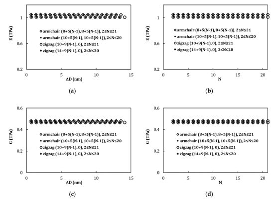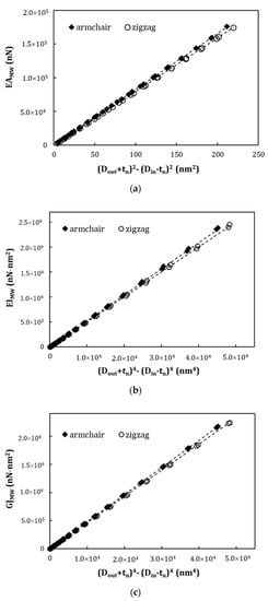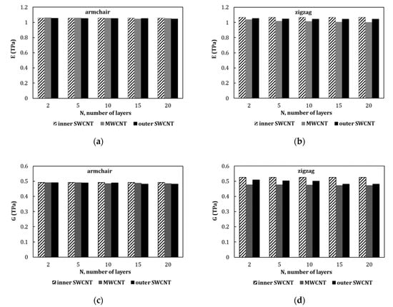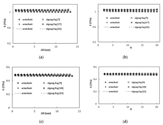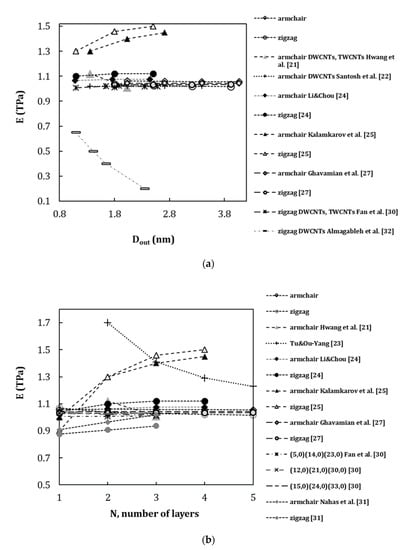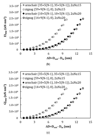 - Equations (22) and (23) offer two robust methods suitable for low-resource assessment to the Young’s and shear moduli of armchair and zigzag MWCNTs. They allow easily characterize the elastic moduli of nonchiral MWCNTs, whatever their inner and outer diameters, and the number of walls. This can be particularly useful, when understanding and modelling the mechanical behavior of MWCNT reinforced materials and MWCNT-based complex structures.