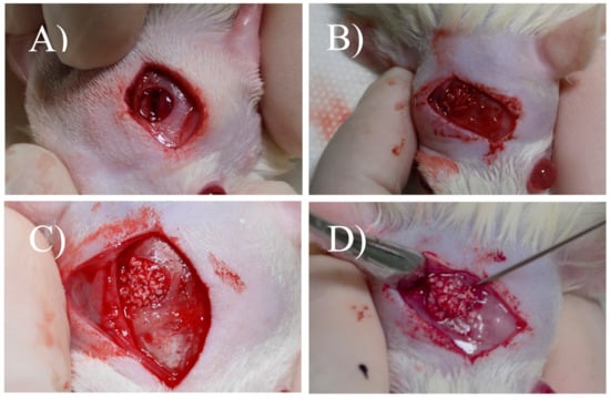 Experimental groups: (A) Blood Clot (G1); (B) autologous bone (G2); (C) xenogenous bone (G3); (D) xenogenous bone and Rigenera-obtained micrograft (G4).