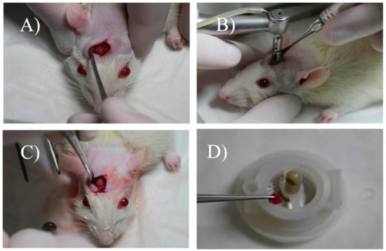 Surgical procedure to create the critical defect in rat calvaria and the use of Rigeneracons. (A) Exposure of calvaria; (B) use of a 5-mm trephine drill; (C) surgical appearance after the creation of the critical defect; (D) placement of the bone fragment in the Rigeneracons device.