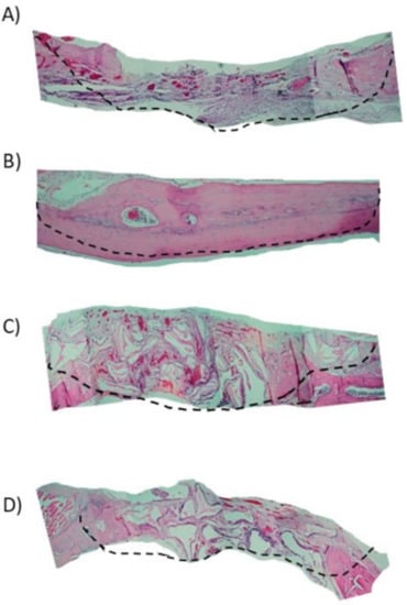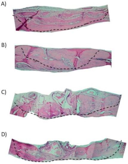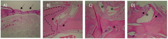 Histological images after 15 days (100× magnification). (A) Blood clot group (G1), arrows indicate Osteotomy region and dashed line represent the stump; (B) autogenous bone group (G2), observe new bone formation between the stump (dashed line) and the autogenous graft fragment; (C) xenogenous bone group (G3)—the asterisks show the particles Bio-Oss®; (D) xenogenous bone associated with the micro graft group (G4)—observe the new bone formation around the Bio-Oss® particles.