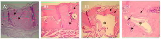 Histological images after 30 days (100× magnification). (A) Blood clot group (G1), arrows indicate new bone formation; (B) autogenous bone group (G2), observe the new bone formation between the bone particles; (C) xenogenous bone group (G3)—the asterisks show the Bio-Oss® particles, observe the new bone formation indicated by the arrows; (D) xenogenous bone associated with the micro graft group (G4)—observe the new bone formation around the Bio-Oss® particles and the presence of blood vessels.