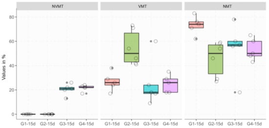 Regarding the presence of non-vital mineralized tissue (NVMT), the analysis showed that there were no statistical differences in the comparison between the groups that received Bio-Oss (G3) when compared with the group that received the Bio-Oss associated with the micrografts (G4) after 15 days, and the variability was absent in groups G1 and G2 (Figure 7).