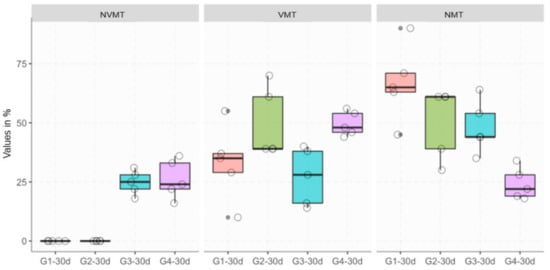 Regarding the presence of NVMT, the analyzes showed no statistical differences in the comparison between the group (G4) and group (G3). Variability was absent in groups G1 and G2 (Figure 8).