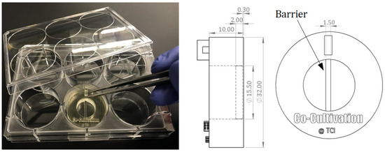 Illustration of a 3D-printed co-cultivation system that is separating two cell types through a dividing barrier. Both cell types can still share one cell culture medium and thereby enable exchange of substances. Picture of the 3D-printed system placed in a commercial well plate (left); CAD drawings of the co-cultivation system with dimensions. All dimensions in CAD drawings are in mm (right).