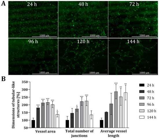 The obtained fluorescence images illustrate that a tubular network was, indeed, formed in the course of time (see Figure 4A). Already after 48 h the slow migration and the associated accumulation of HUVECs can be seen, as smaller gaps are formed in the cell layer. These gaps become much wider after 72 h and over time, as the HUVECs accumulate more and more in a tubular structure. The cells gradually develop into a tubular-like network with increasing vessel or tube length, while the thickness of the formed tubes is declining. Quantitative analyses also revealed that the dimensions of tubular-like structures increased over time (see Figure 4B) when compared to HUVECs only cultured in mono-culture within 3D-printed systems. The dimensions of the vessel area, the total number of junctions, and the average vessel length was more than doubled after around 72 h. The average length of the vessel in particular notably continued to extend as time progressed (i.e., to 286% ± 47% after 96 h, and ultimately to 280% ± 48% after 144 h). By contrast, the vessel area and total number of junctions both decreased again after 144 h—with a p-value of 0.0399, the dimensions of the vessel area are only slightly significant different, and no significant difference was observed for the total number of junctions compared to the dimensions after 24 h. Fluorescence images taken after 144 h of co-cultivation also highlighted that the tubular-like networks formed wide holes, while the thickness of the developed tubes declined. One potential reason for the reduced vessel area and thickness of tubular structures after 144 h could be due to the loss of cells via detachment of dead cells.