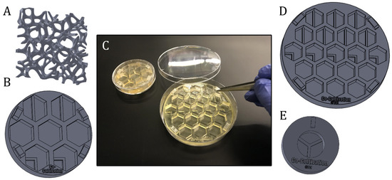 Presentation of different experiment-specific co-cultivation platforms and approaches. (A): Scaffold structure that can directly be seeded with cells, coated or filled with matrix substrates (B): Screening platform, which is fitting in a regular petri dish Ø 60 mm. (C): Illustration of the handling of 3D-printed screening platforms, which are fitting in commercial petri dishes with diameters of 60 mm or 90 mm. (D): Example of a co-cultivation platform with 19 wells for screening approaches. The system is fitting in a regular petri dish with a diameter of 90 mm. (E): Co-cultivation system allowing separate growth of three different cell types, while sharing still one cell culture medium.