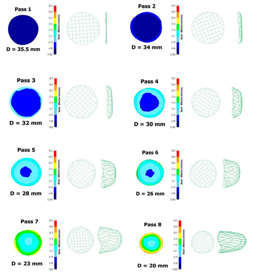 The results of plastometric studies were used as input parameters for computer modeling. Detailed information can be found in “Supplementary Materials” section. To study the level of metal processing during deformation using FEM-simulation, the parameter “equivalent strain” is usually considered. In many sources, it is often indicated as “accumulated strain” because it is a cumulative parameter, i.e., after the load is removed, this parameter is not reset, unlike the stress.