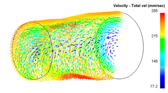 Since radial-shear rolling is a cross type of rolling, it is advisable to study the equivalent strain not only in the longitudinal, but also in the cross-section of the workpiece—this will allow to evaluate not only the numerical values of the parameter, but also the nature of its distribution over the cross-section during deformation. When analyzing the equivalent strain (Figure 5), it was found that the distribution of this parameter fully corresponds to the cross type of deformation when the workpiece rotates around its axis, since in the cross section, clearly visible ring zones of strain development. At the same time, relatively large unevenness of the strain distribution in the radial direction can be noted.