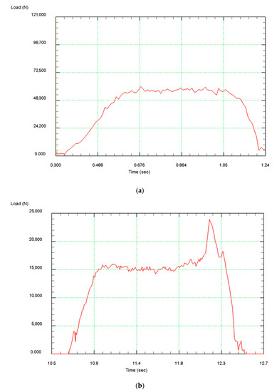 Character of force graphs for radial-shear rolling: (a)—total compression up to 20% (1st pass); (b)—total compression over 20% (8th pass).
