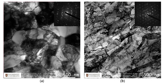 The deformed microstructure was studied by transmission electron microscopy (TEM) in a light field and by electron diffraction on a JEM-1400 Plus microscope (Jeol Ltd., Tokyo, Japan) at an accelerating voltage of 80 kV and x magnification.