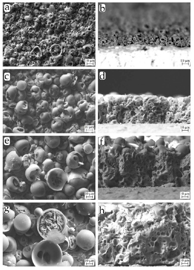 SEM images of the coating cross-sections show that structural elements such as spherulites, hemispheres, and plate-shaped crystals were contained only in the coating surface (Figure 1b,d,f,h). The inner structure of the coatings included multiple branched microsized pores and pore channels (0.5–30 µm in size) inhomogeneously distributed through the coating thickness.