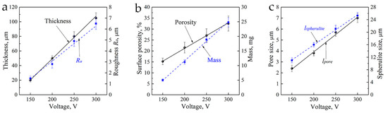 Plots of the coating thickness and roughness, (a) surface porosity and mass, and (b) size of the spheres and pores (c) against the microarc oxidation (MAO)-applied voltage.